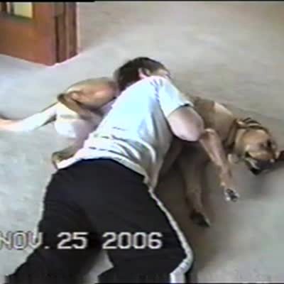 A man scratches a dog's back and the dog's legs vibrate and scratch on the wood floor