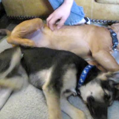 Two dogs lie next to each other on a living room floor. A man scratches one dog's back. It shakes its leg and scratches the back of the German Shepherd dog lying next to it.