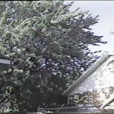 Chaos ensues as a man loses grip of a portable basketball goal in a driveway. A woman tries to help as she stands behind him, holding the edge of the backboard while screaming all the while, as the man tells her to get away. Security footage.