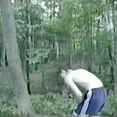 Man tries to use a water balloon sling shot, but it backfires and he shoots the balloon at himself. Summer.