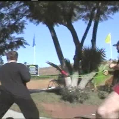 A man rolls around on the grass at a golf course after a ball backfires in to his groin as he tries to shoot it out of a slingshot.