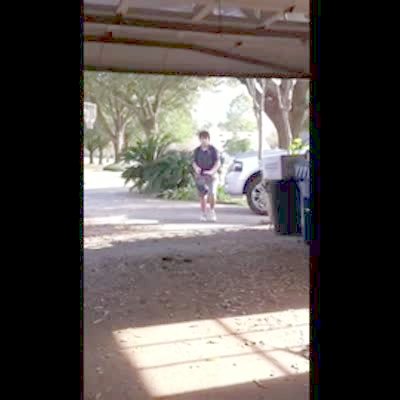 A boy walks into a garage after coming home from school. His dad jumps out of a garbage can behind him and falls on the floor. He tried to scare the boy, but jumped too late and fell. Pranks bonehead.