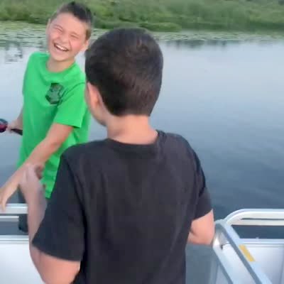 A young boy fishes on a boat in a lake and casts a line and the bait fish hits him in the back of his head.