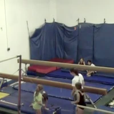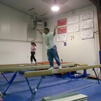 In a gym, a teen girl does a balance beam gymnastics routine. She jumps, does a front flip, lands on her crotch on the balance beam, and falls off onto the gym mat. Very hard fall.