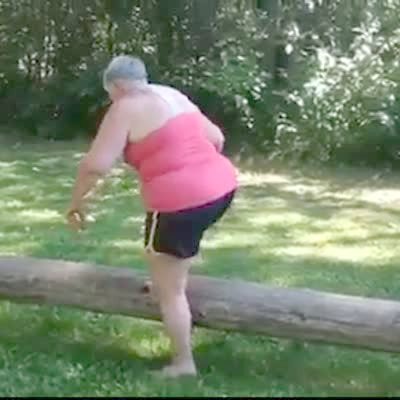 A senior woman pretends to be a gymnast and uses a log as a balance beam. She falls off the log a couple times, but falls to the ground when she jumps and spins to dismount the log.