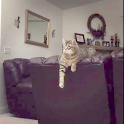 A cat lies on the back of a couch and swats a balloon repeatedly before the cat catches the balloon in its paws.
