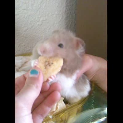 A hamster shoves an entire banana chip into one side of its mouth in a house