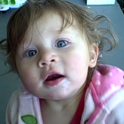 Tot girl repeats / says "banana" by sticking her tongue in and out. Cute.