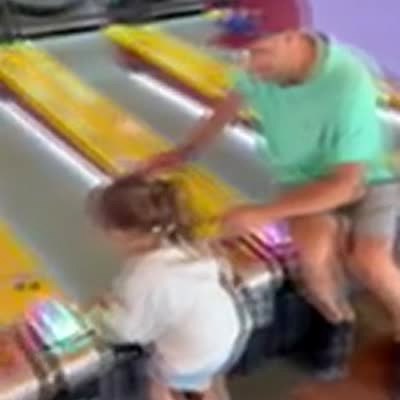 A man throws a skee-ball at an arcade. Then he tells his young daughter to throw one. The girl tries to throw it several times but it does not make it up to the goal. Then the man tells her to throw it as hard as she can. She hits him in the head with the ball.