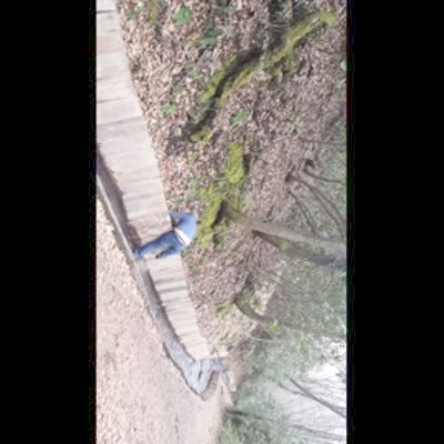 A man tries to step over a stream and falls on the bank wall on the other side.