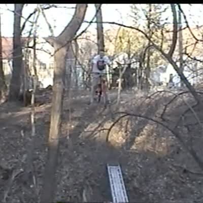A teen boy tries to ride a bicycle across a stream outdoors on a narrow bridge and crashes into the bank headfirst.