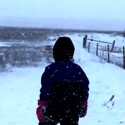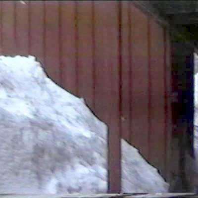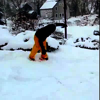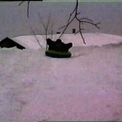 Exploding Inner Tube. On snow bank, boy rides inner tube & it pops after a snow bank leap.