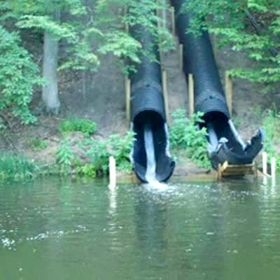 A senior woman hits a golf ball off of a water hazard bank but it goes backwards and rolls into the water behind her.