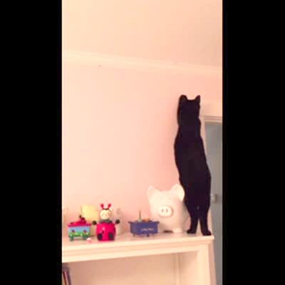 A cat reaches for a bug on the ceiling. The cat falls off the shelf it stands on and knocks a piggy bank off with it. The piggy bank breaks/ shatters on the floor.