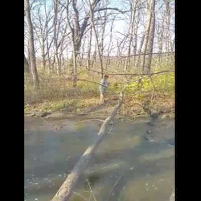 A man runs across a tree over a river. He jumps to the bank at the end, but falls in the water.