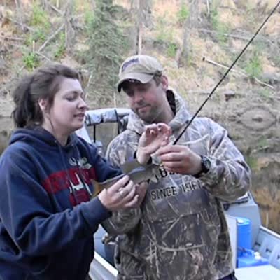 A woman is touching a fish that has been caught. It flops, she screams, and slips and falls on lake bank at 0:27.