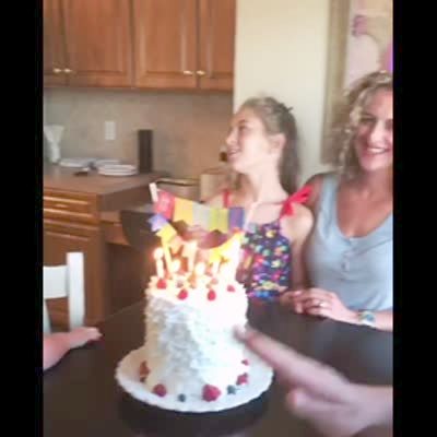 Two girls and boy hold banner and sing happy birthday in kitchen, border collie dog steals mom's cupcake off table and woman screams.
