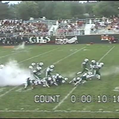 High school football team runs through big banner smoke, team members trip over one another they all fall down. Hard to see because of the smoke.