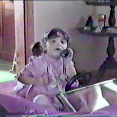 Little girl in pink Barbie car runs into living room table.