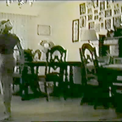 Tot girl in Barbie car reverses, runs over dad's foot in hallway, then backs up into him laying on floor. Dad plays it up.