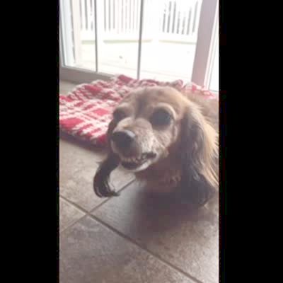 A man tells his dachshund dog to smile and she bares her teeth in a smile.