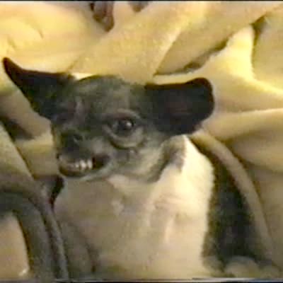 Woman says "nice little puppy" when tiny Pomeranian kisses man. Then woman shrieks "Cujo puppy!" and man shakes dog, dog freaks out, growls, bares teeth. Goes nuts. Then dog goes back to kissing man. dog