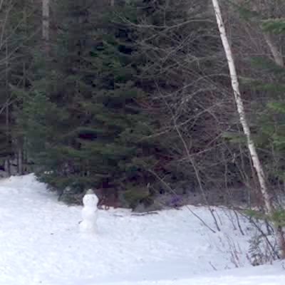 A tree falls just barely behind a snowman and doesn't destroy it.