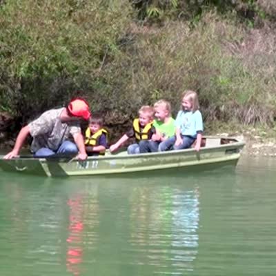 A man in a boat on a lake catches a fish with his bare hands and two young girls scream until he drops it back in.