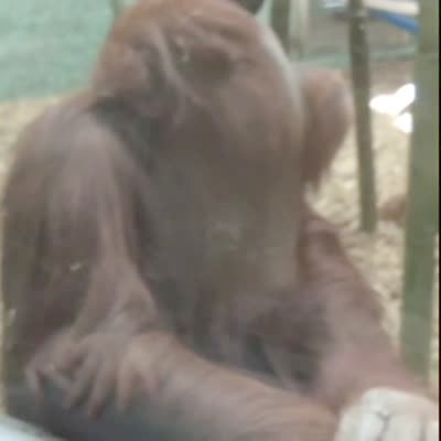 A young girl tells an Orangutan at the zoo to say cheese. The girl poses next to the glass, the orangutan opens his mouth and bares his teeth as if to eat the girl. The girl jumps back. Her parents laugh.