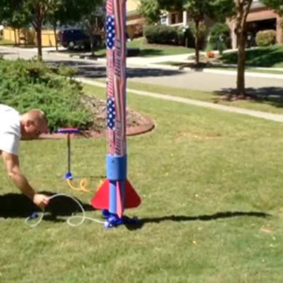 A man pumps water into a rocket outdoors and after a woman says that they'll get soaked with water when it launches, the man triggers the rocket and it barely bounces off the ground before falling over.