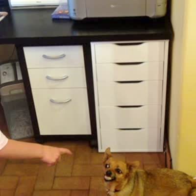 "Mugging Mutt" A woman films her dog's poop on the carpet, then turns to her dog to scold him and he bares his teeth in a smile.