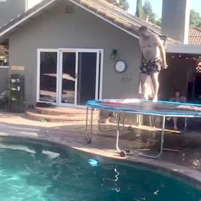 A man bounces on a trampoline in a yard and tries to jump into a swimming pool and loses his balance and barely makes it into the pool.