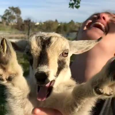 A young girl at a farm laughs and teases some goats on the other side of a fence with some food. One goat jumps though the fence. The girl has a late reaction but screams.