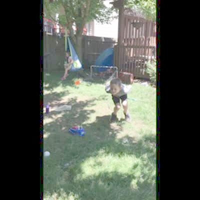 A tot boy in a yard hits a ball off a tee with a baseball bat and it hits a man in the groin and the tot boy laughs. Security camera.