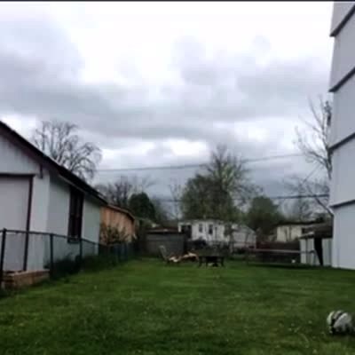A teen boy uses a baseball bat and struggles to break the layer of ice on the top of a swimming pool. A small dog pushes the teen into the pool. Security Footage