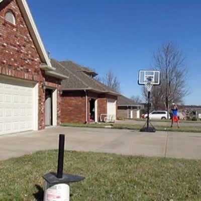 A baseball hangs from a basketball net by a string, and a young boy learns to hit the ball with a baseball bat in his front yard. His dad swings a bat to show him how to hit the ball. The bat swings behind him, and cracks the windshield of the man's car.