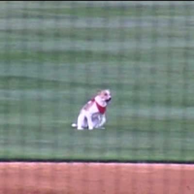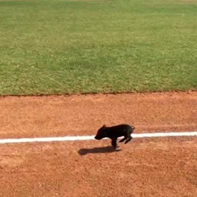 Terrier dog gets loose on baseball field during minor league game, runs around diamond, poops on field (No audio)