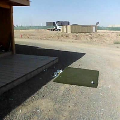 A military man swings at a golf ball on a base and breaks the head of his golf club.
