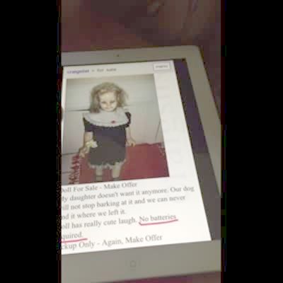 A woman tells her daughter that her dad is getting her a scary doll off of Craigs List and the girl and brother and sister think the doll is haunted based on what the ad says.