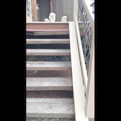 Three puppy dogs run down stairs while a fourth dog slides down the base of a rail beside the stairs.