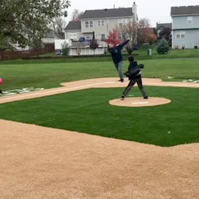 Boy playing baseball in the backyard trips over big dog when running the bases & falls down.