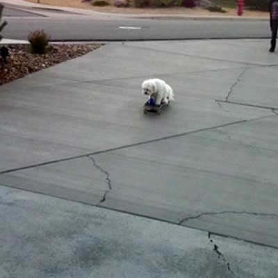 A small dog sits on a skateboard that rolls down a sidewalk and gently crashes into the base of a basketball hoop. Short tails.