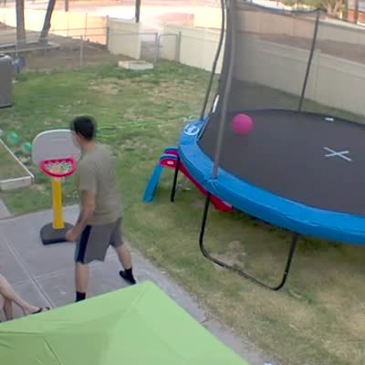 A man shoots a basketball at an inflatable basketball hoop in a yard and misses. Another man with the camera says "I've never seen so many misses". The man grabs a ball and throws it over his head and it goes in. Featured talent cleared only (boy and man without a shirt on).
