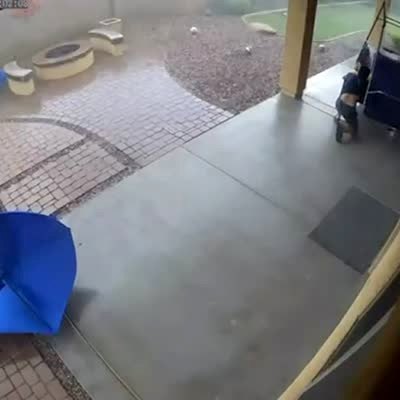 A man rushes to move backyard furniture during a storm. He runs to put a chair under a porch but he slips and falls. Then a basketball hoop game falls over and hits him in the head. Security Camera