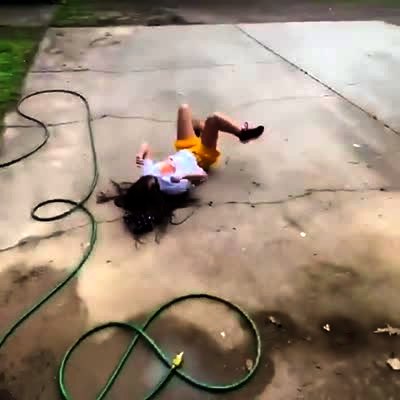 A woman tries to pick up a children's basketball hoop in the driveway with her foot. She slips, gets her foot stuck in the net and falls over. Security footage.