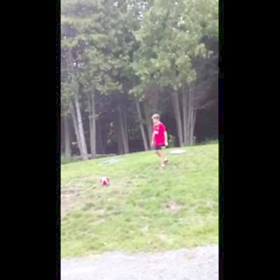 A boy kicks a soccer ball into a basketball hoop from across a street outdoors. Trick shot.