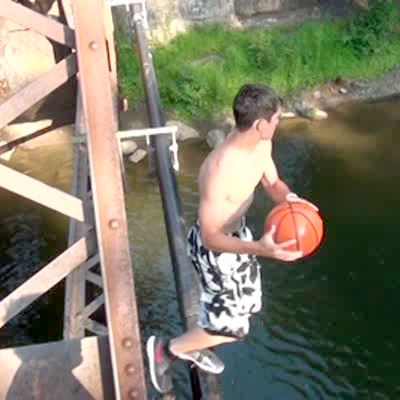 A man throws a basketball from a bridge jumping in to a river and makes a trick shot.