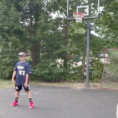 Basketball, guy over shoots hoop, ball bounces back in. (trick shot)