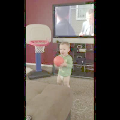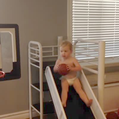 A tot boy makes a backwards basketball trick shot indoors.
