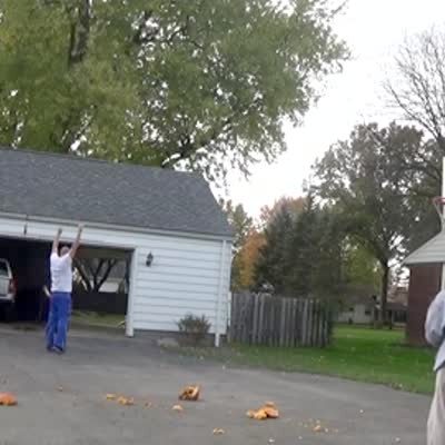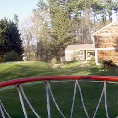 A man looks into the camera and throws a rubber ball over his shoulder and the ball hits the roof and rolls off, bouncing off a mini-trampoline, and goes into a basketball net on the lawn.